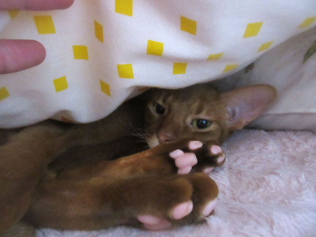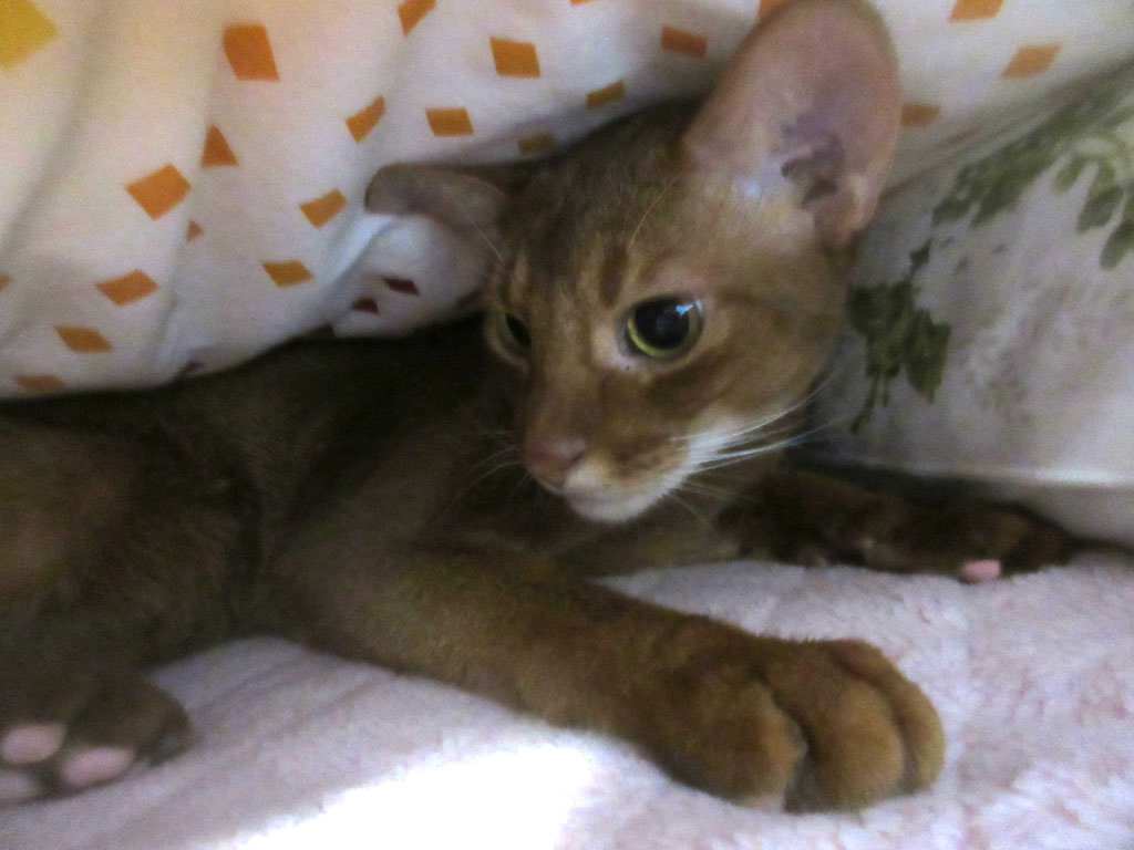 1週間ほど前、一時、晩、私と一緒に寝てくれたアビのすけですが、最近は一緒に寝てくれず、一人、寝場所のキャットテントで寝ているのですが、それでも、晩、私が布団に入ると、必ず、1回は、私の所にやって来て、少しだけ一緒に寝てから、自分の寝床に行くという、本当に人懐っこいアビシニアン君なのです。