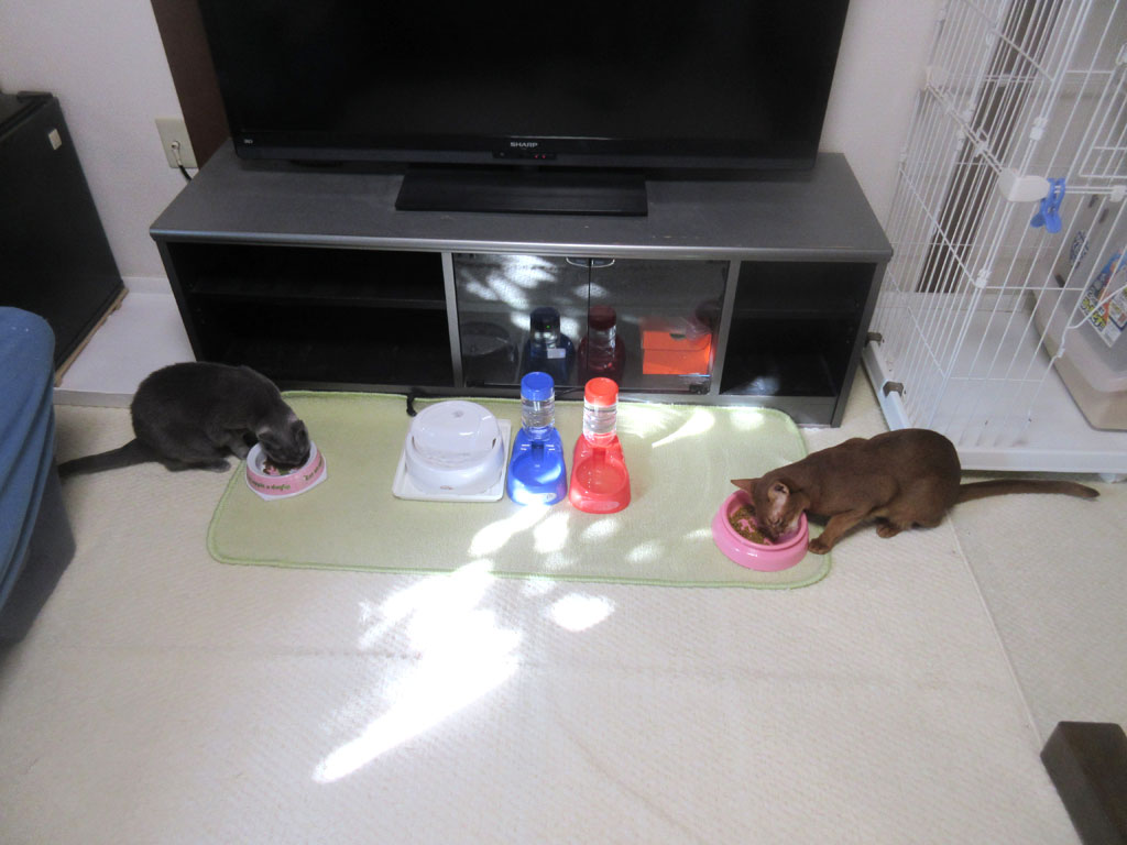 これは、今日の猫たちの朝ご飯の風景…、木漏れ陽が入って来る中、ロシ子もアビのすけも、頑張って朝ご飯を食べてくれていました。