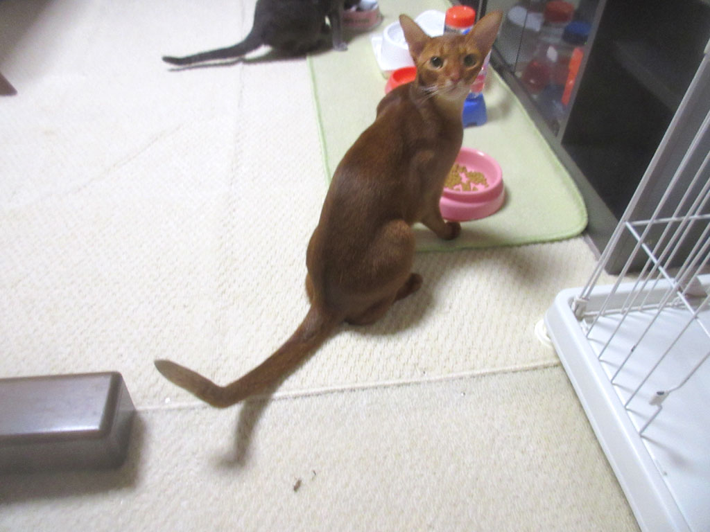 そして、食べるのを中断して、こっちにやって来たアビのすけ君…、黙って食べていたら良いのに、面倒な事にも顔を突っ込みたがる、野次馬根性のアビシニアンのアビのすけ君。