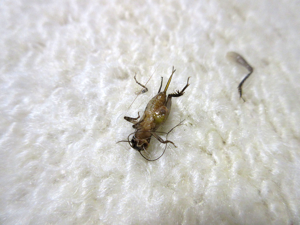 そして、ジャぁ〜〜ん!? その絨毯の上の物体とは、鈴虫くんでした…、これ、絶対に、アビのすけが鈴虫と遊んでいる内に、死なせてしまったんだと思う。