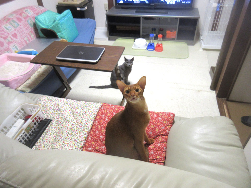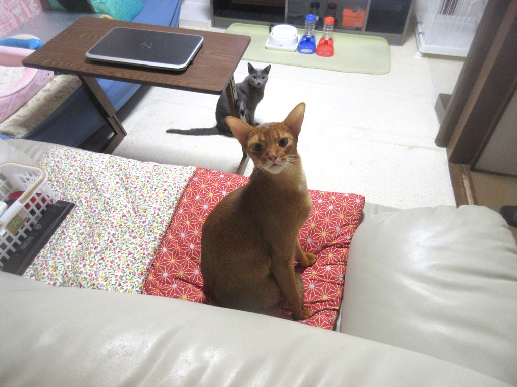 ロシ子は最近、ケージの3段目の猫ベットで目を覚ます事が多かったのに、今朝はソファーの背もたれの部分で、そしてアビのすけは、最近は私と一緒に寝てたのに、今朝はソファーで寝とった…。
