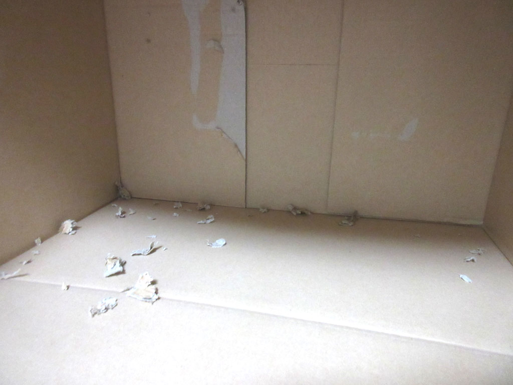 アビのすけの噛みちぎり跡。昨日かおとといにも、この中を掃除したのですが、また、段ボールの噛みちぎり跡だらけ…。