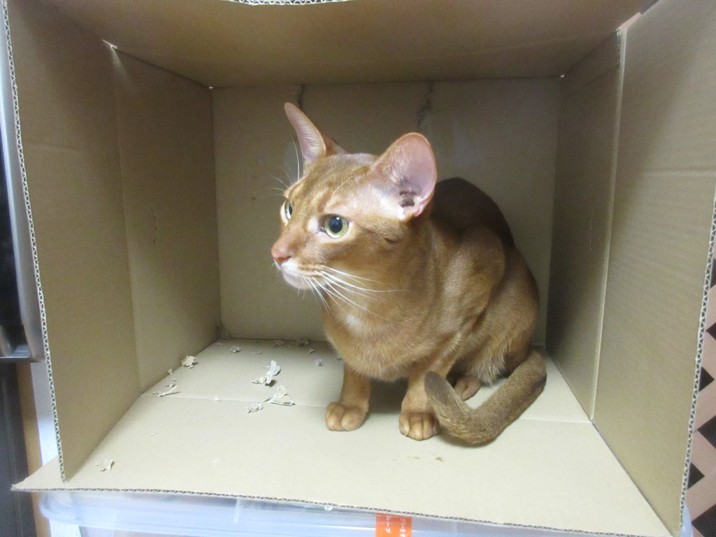 悪戯坊主のアビのすけ。悪戯坊主、アビシニアンのアビのすけ君…、段ボールの切れ端を誤飲して、子猫の時の様に、開腹手術なんてご免だから、この後、この段ボール箱を撤去させて頂きました…。