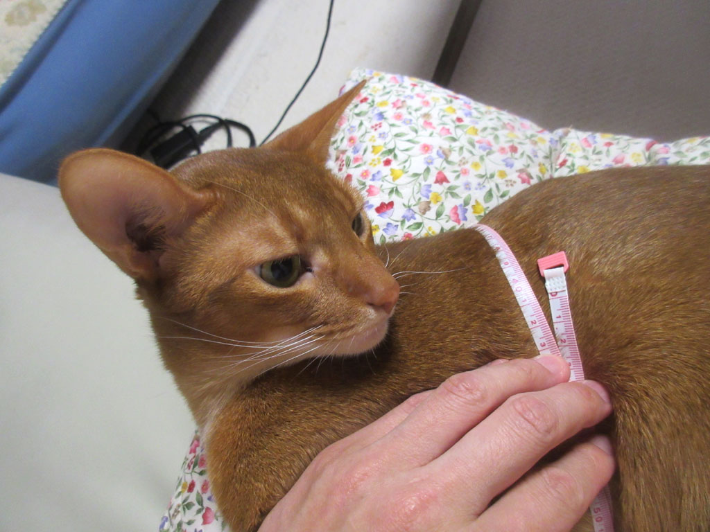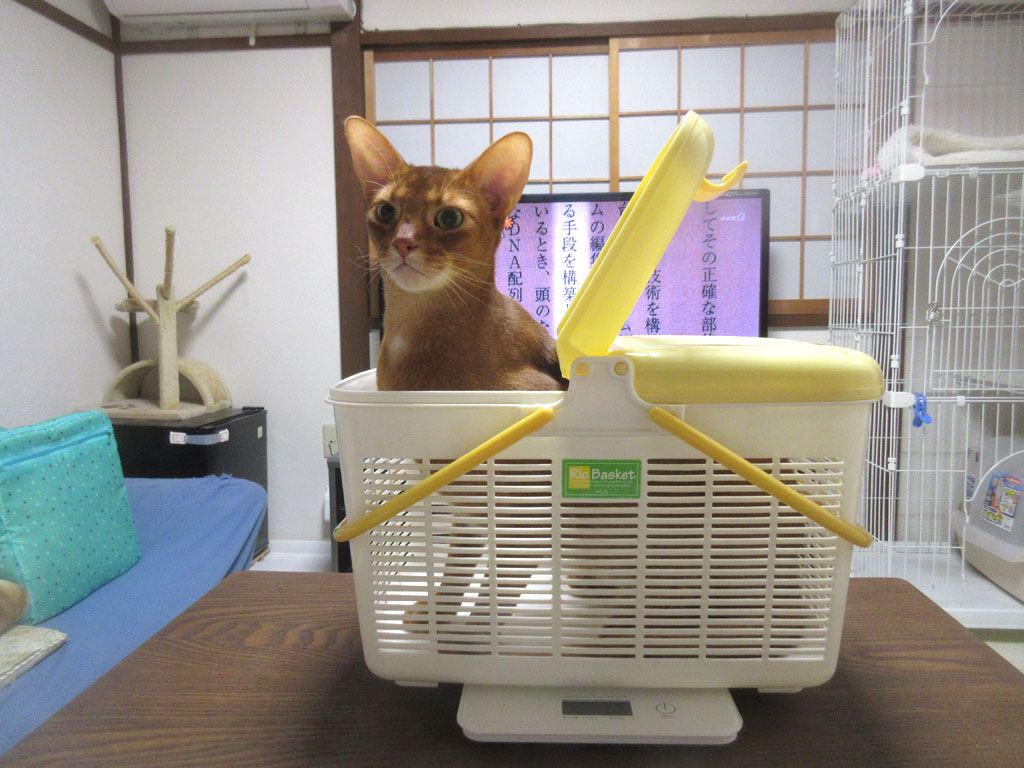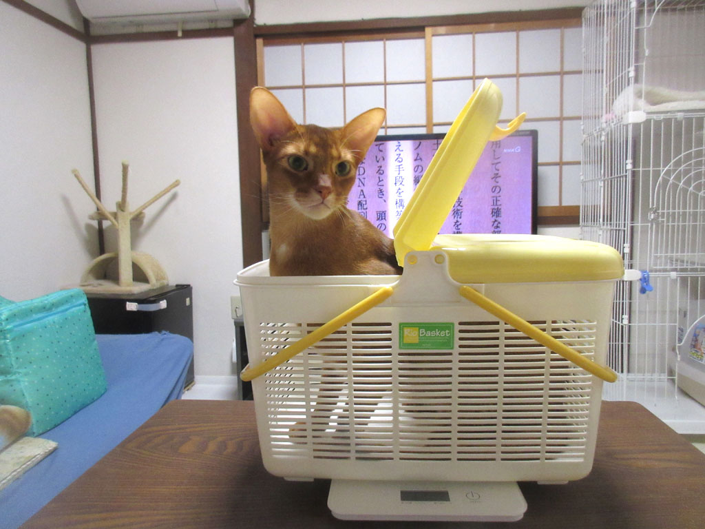 そして、同じ日の朝にした、アビシニアンのアビのすけ君の体重測定の様子。