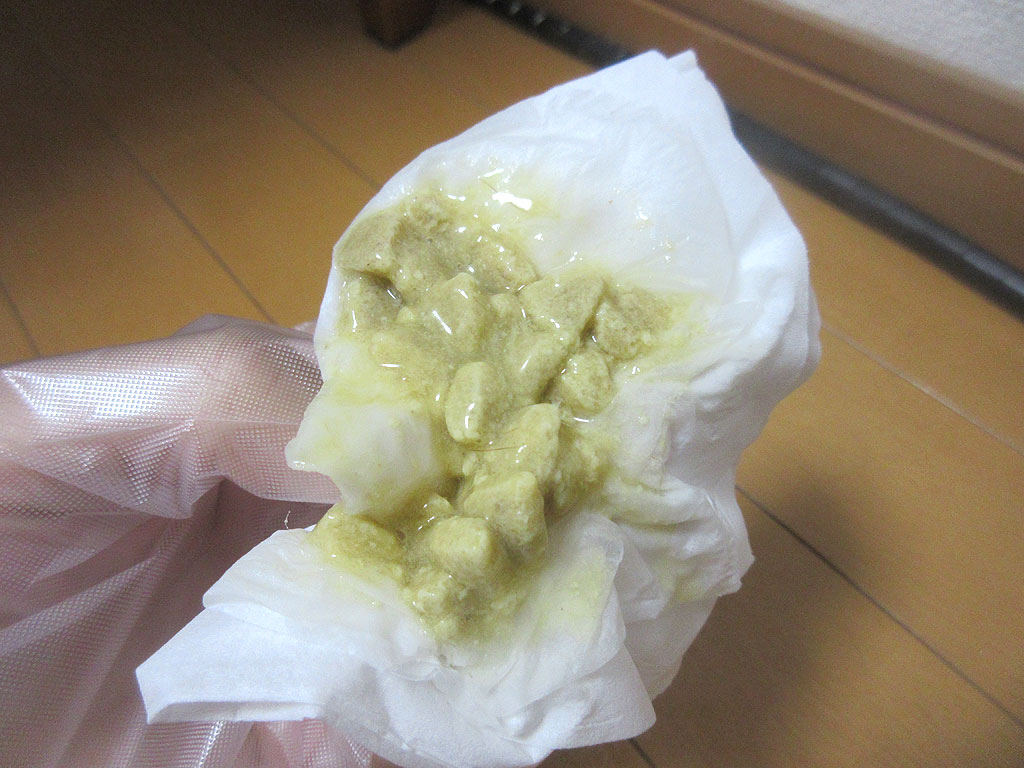 ティッシュで取って見てみると、たっぷりの唾と胃液とふやけたカリカリ…。