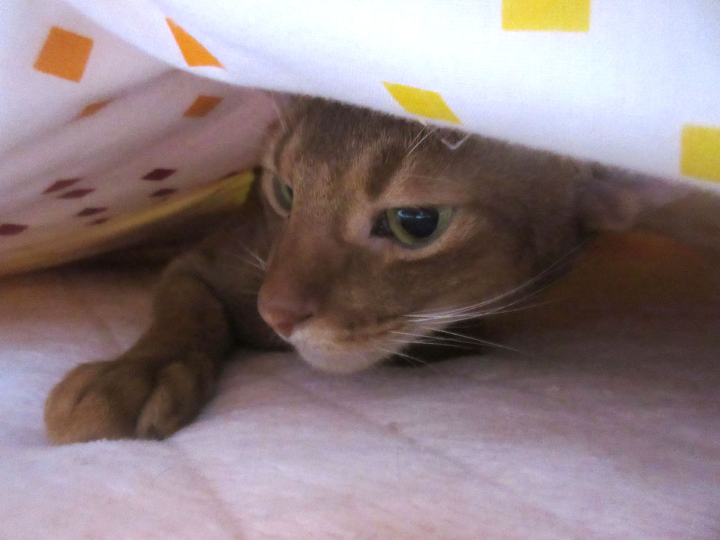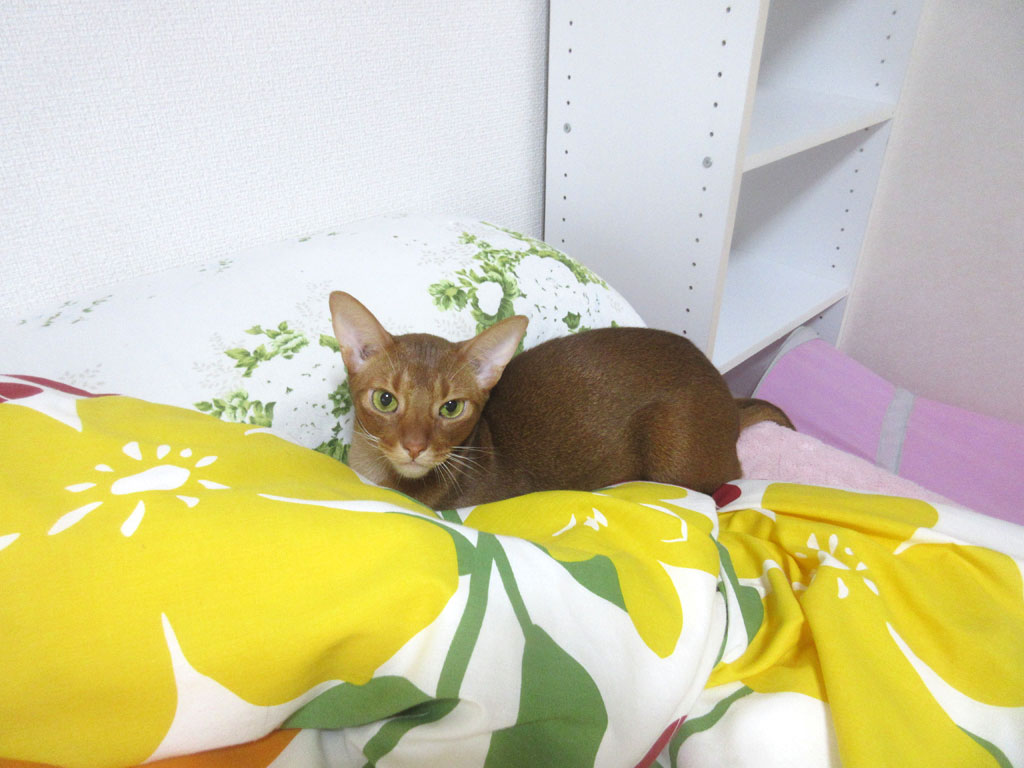 そしてこれは、その翌日、今日からすると、ちょうど1週間前の朝の事…、布団の中でぐっすり、相変らず、寝坊助のアビシニアンのアビのすけ君。