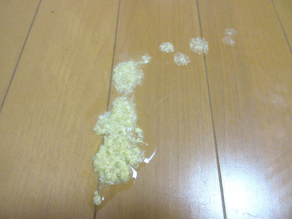 そしてアビのすけは、吐く時は毎回、2回か3回に分けて吐く事が多いので、部屋の中を見渡してみたら、やっぱり、もう1ヵ所、吐いとった…、テーブルの下…。