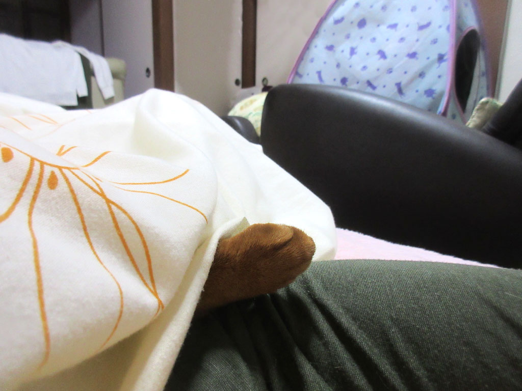 今朝のアビのすけ君。これ、今朝6時過ぎ…、出ている手は、ご承知の通りのアビのすけ君のお手々…。