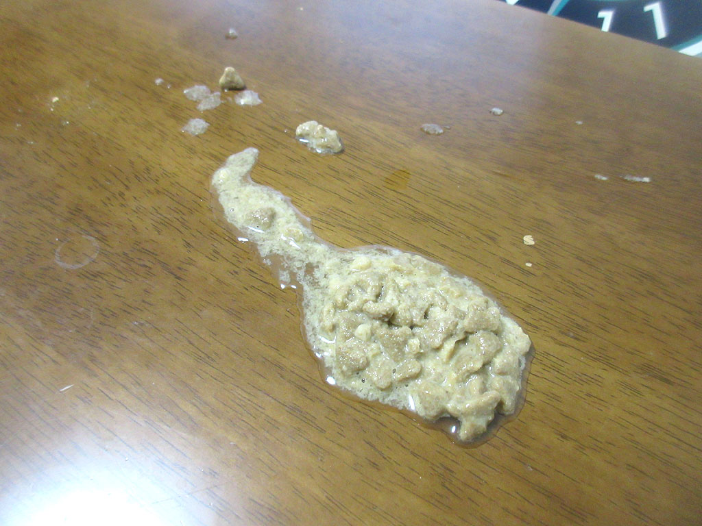 この事実から見ると、もう、朝ご飯を一気食いした事で吐いてしまったとしか考えられない…、低分子プロテインでも吐いて、インドアでも吐いて、一気食いをさせない様、2回分けご飯にしているのですが、これで吐かれてしまったら、なす術がない…。
