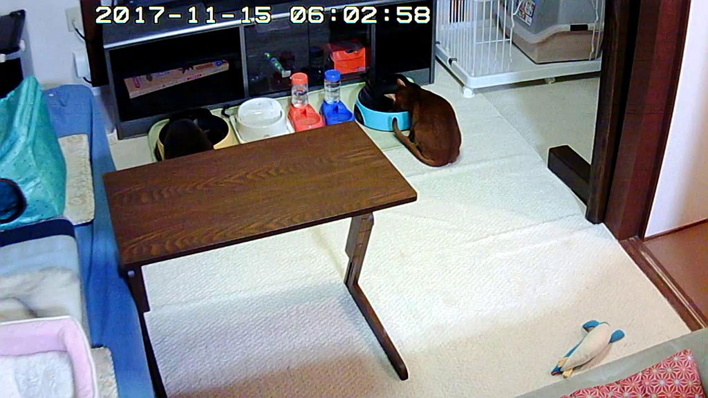 そして、各々のポジションに戻った猫たち…、と言うか、アビのすけが自分の自動給餌器に戻り、弾き出されたロシ子も、自分の自動給餌器に戻ったって感じ。