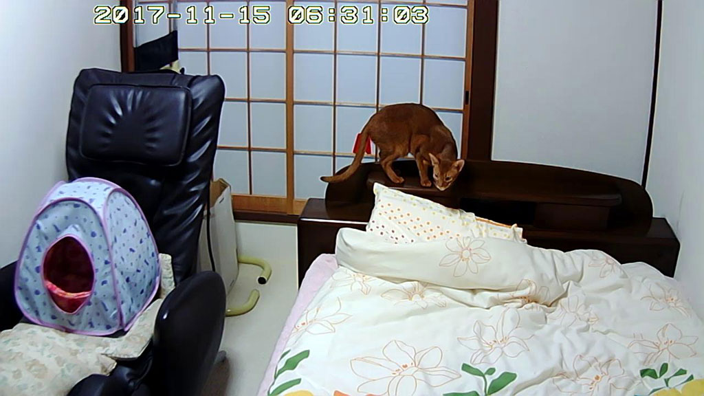 そしてここからは、男前のアビのすけの4連発…、今度はこっちの部屋に来て、悪戯を始めたアビのすけ…、と言うか、私の枕が掘り起こされてますが、100%、アビのすけの仕業に違いない…。