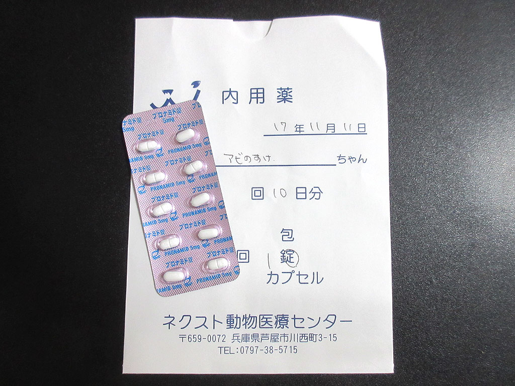単発の1回だけの嘔吐だったので、この時は、この「プロナミド錠」はアビのすけに飲ませませんでしたが、頻繁に嘔吐が続く様であれば、これをアビのすけに飲ませてあげようと思っているのです。