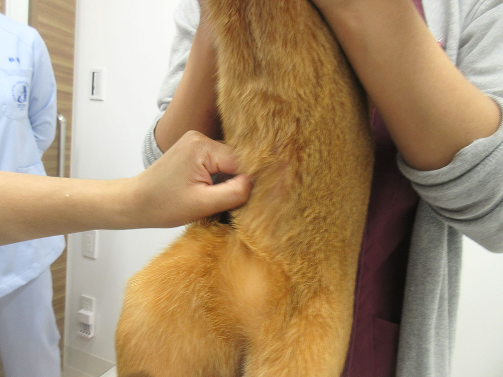 そして、院長先生が入って来られて、アビのすけの皮膚炎の診察がスタート…、この日の前日位に、私が家でアビのすけの新しい皮膚炎を発見したのですが、先生に診察をして貰っている時に、それとは別の、新たに出来た皮膚炎も発見してしまって…。