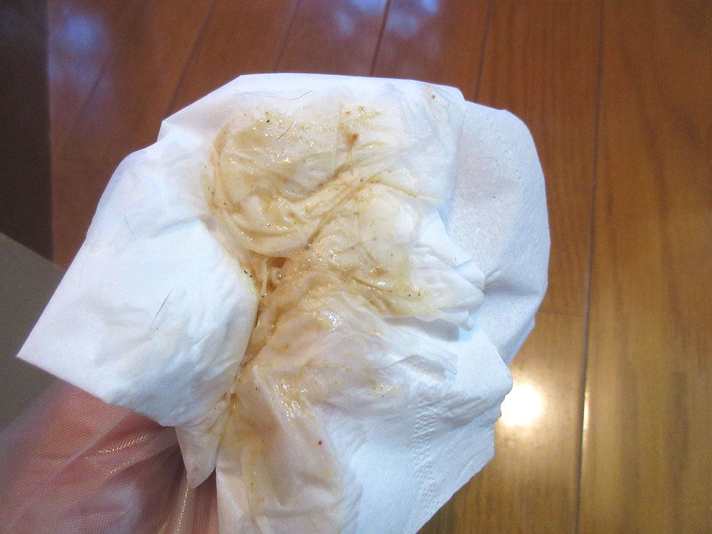 食べた物も半分なので、吐いた物も半分…、それにしても、1回目ご飯の全量を吐いている…。