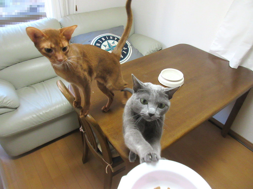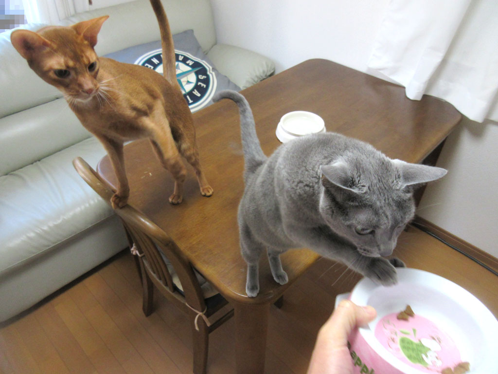 そして、嘔吐から約40分後…、アビのすけには2回目ご飯…、ロシ子には食べ切れなかった分のご飯…。