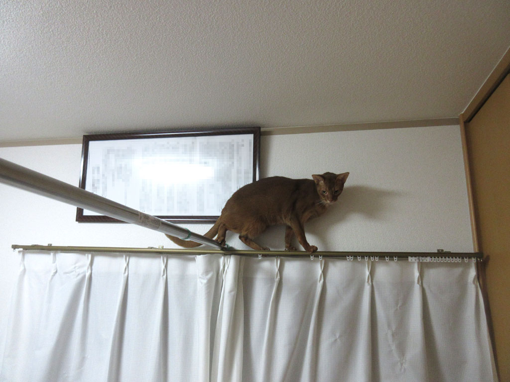 こっち側のカーテンレールの上にも上った事はなかったのですが、物干し竿がある事によって、足場が出来て、それで、新たな悪戯を思い付いたみたい…。