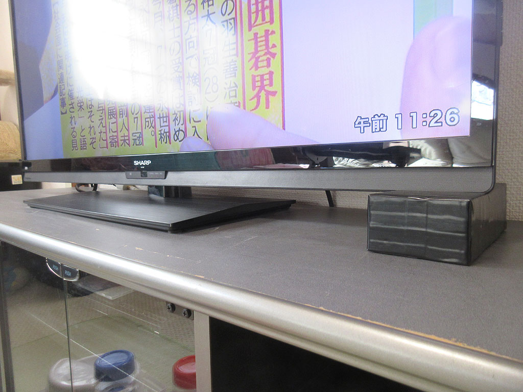 そして、テレビの両サイドの下側に、このスポンジゴムをかましてみると、めっちゃ、良い感じ…、って思ったんだけど…。