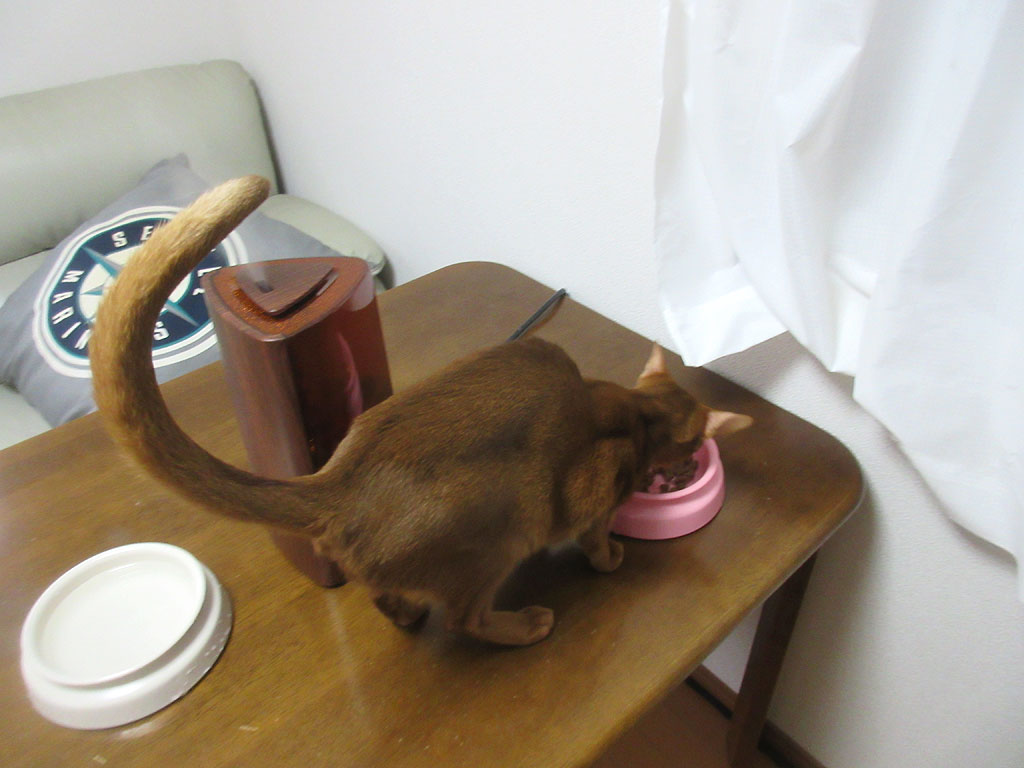 尻尾がピンピン、と言うか、ビンビンと言うか、もう、「とっても喜んで食べてるぞっ!」て言うのを体全体で表現をして…、2回目ご飯をガッ付いていたアビシニアンのアビのすけ君でした。