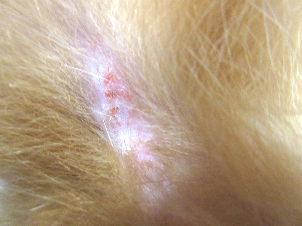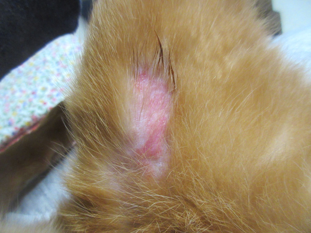 舐めた形跡あり。この状況って、やっぱり、全く良くなってないよな…、舐めた形跡も残ってて、アビのすけ、やっぱり痒いんだな…。