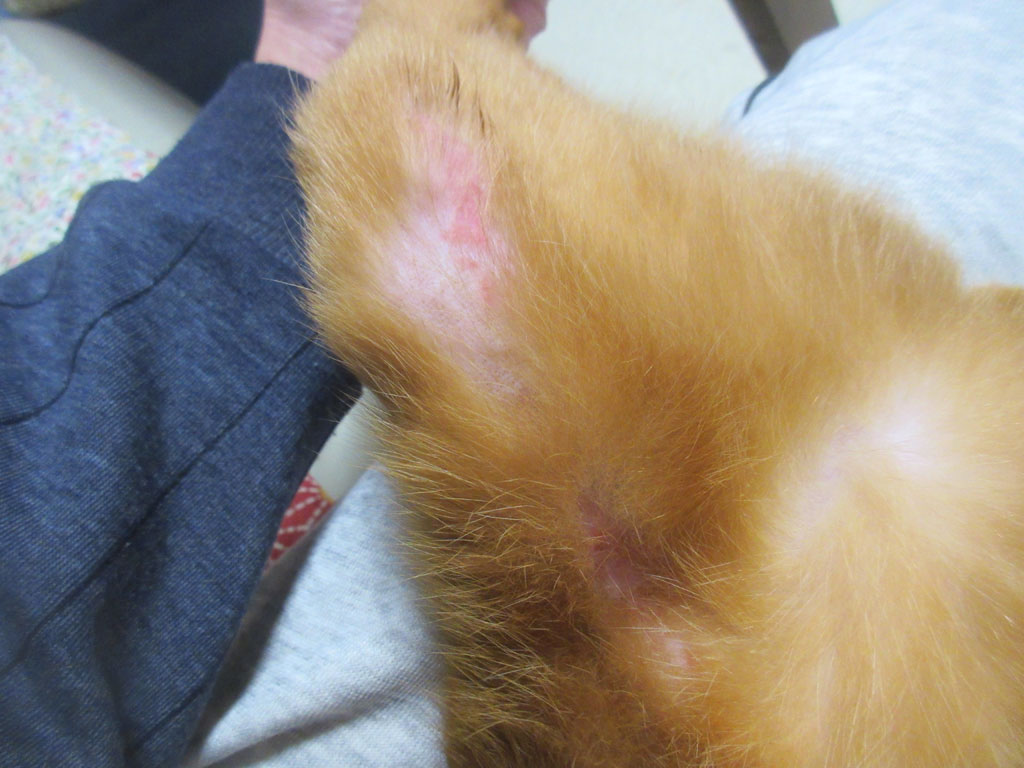 あびのすけの2ヶ所の皮膚炎。アビのすけの2ヶ所に皮膚炎…、さっきの写真の膝の内側の皮膚炎は分かりやすいけど、左下腹部の皮膚炎は、ちょっと分かりにくいかな…。