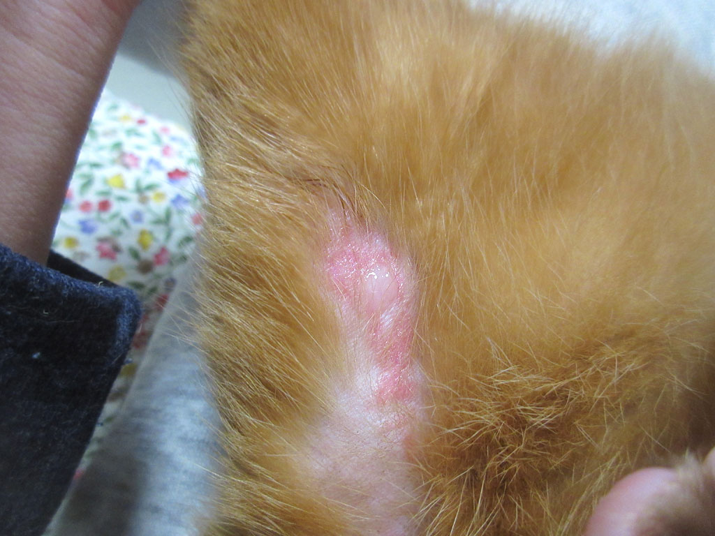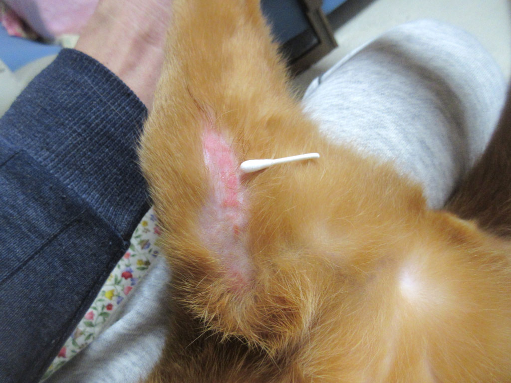 そしてこの部分、もう、左膝の内側の皮膚炎と一体化しつつありますが、アビのすけの左下腹部の皮膚炎にも、モメタオティックを1滴。