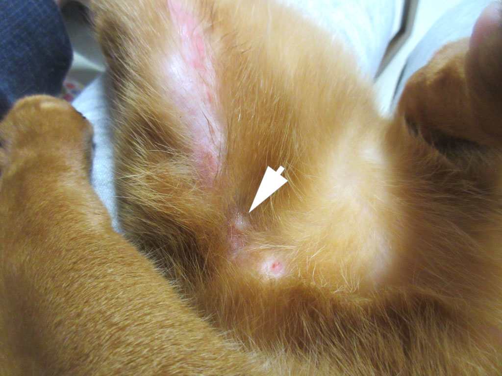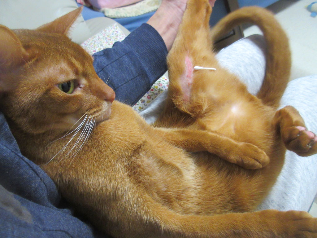 何と、アビのすけの右足の膝頭の内側、右の下腹部辺りに、新たな皮膚炎を発見してしまいました。