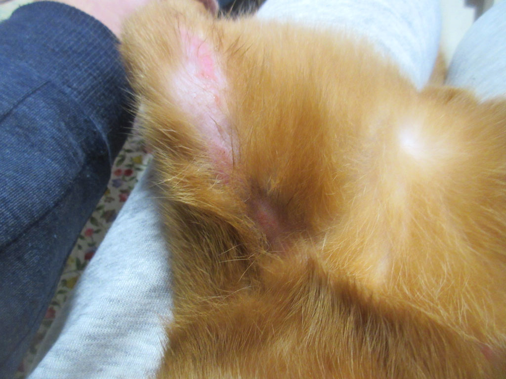 これは、昨日の晩のアビのすけの皮膚炎の様子…、モメタオティックを塗った後。