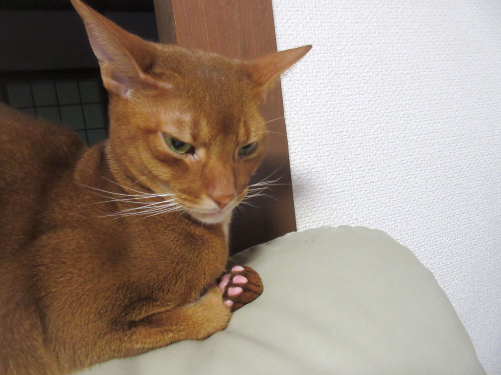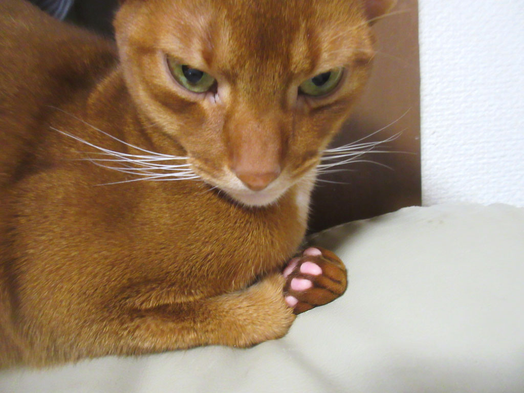 アビのすけはアビシニアンのレッド君なので、肉球はピンク色…、同じアビシニアンでも、ルディー君は茶色系だし、フォーン君はレッドとはちょっと違ったピンク色だし、同じアビシニアンでも色々。
