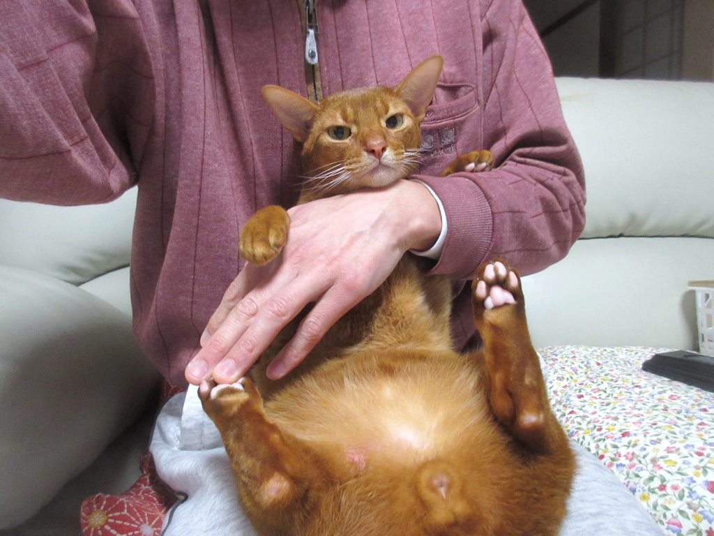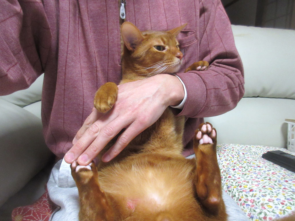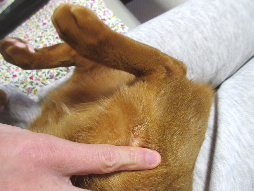 そんな感じで、私はホっとしていたのですが、それも束の間、一応、それとなしにアビのすけのボディチェックをしていたら、アビのすけの右膝の外側に、舐め舐めした跡が…、もしかして、また皮膚炎じゃないやろね…。