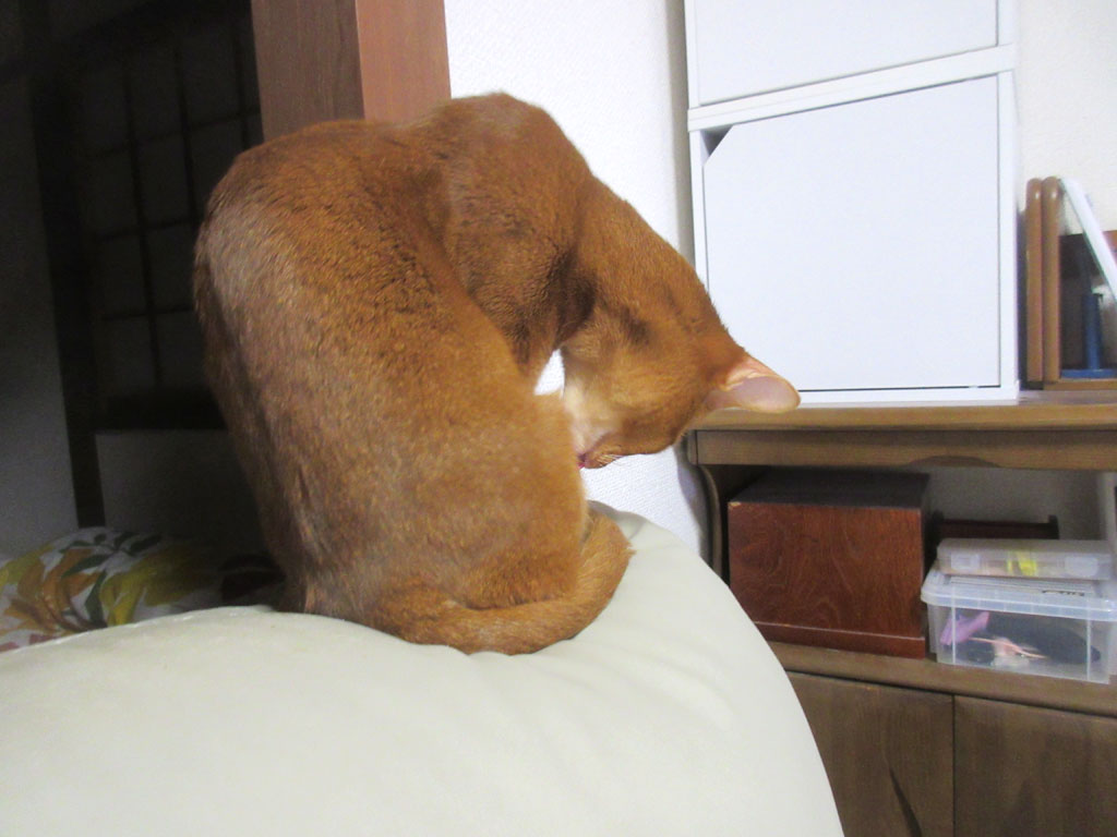 そして、晩ご飯を食べ終わった後のアビのすけ君…、早速、舐め舐めを開始…、舐め舐め、舐め舐め…。