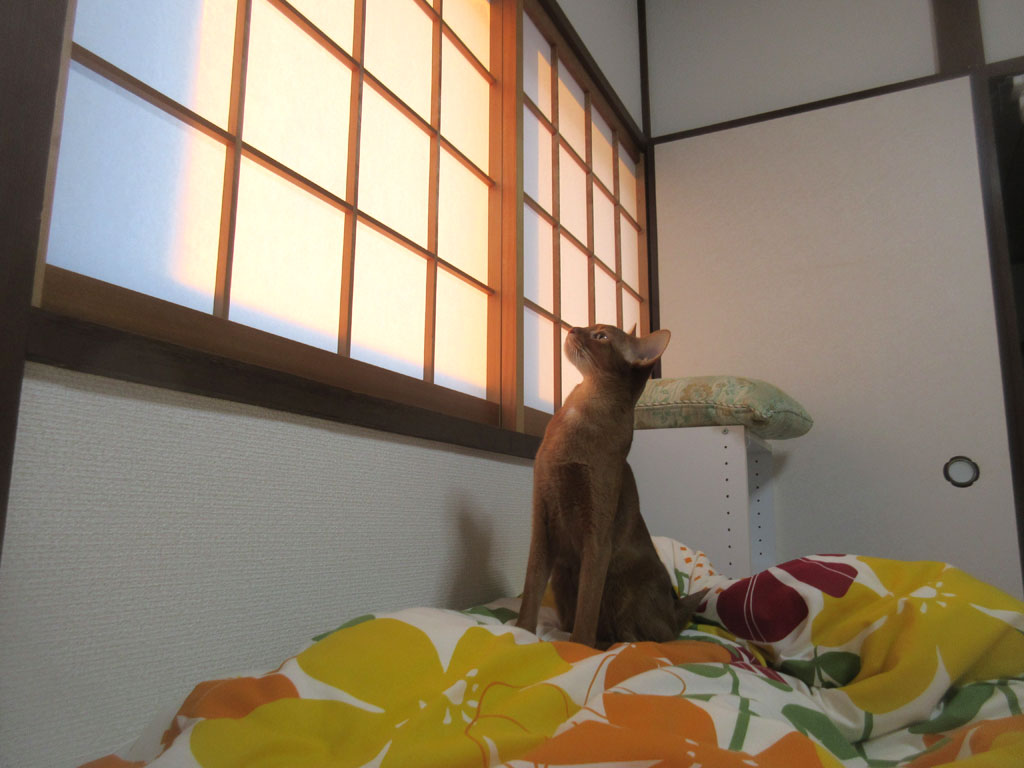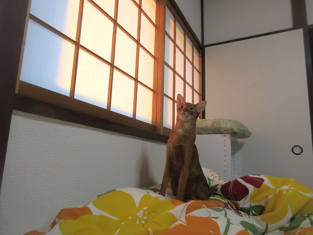 この障子には、外で鳥が飛んだりとかしたら影が写って、猫の習性からか、動くものに釘付けになってしまうアビのすけなのです。