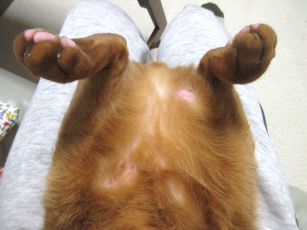 昨日のアビシニアンのアビのすけ君のブログからの続きです…、これは、おとといの2/12(月・祝)の晩のアビのすけ君ですが、1週間前の2/5(月)にアビのすけの新たな皮膚炎を発見し、2/6(火)・2/7(水)・2/8(木)と3日連続でモメタオティックを塗り、そろそろ皮膚炎も良くなってるかな、なんて思いながら、この日、アビのすけの皮膚炎をチェックしていたのです。
