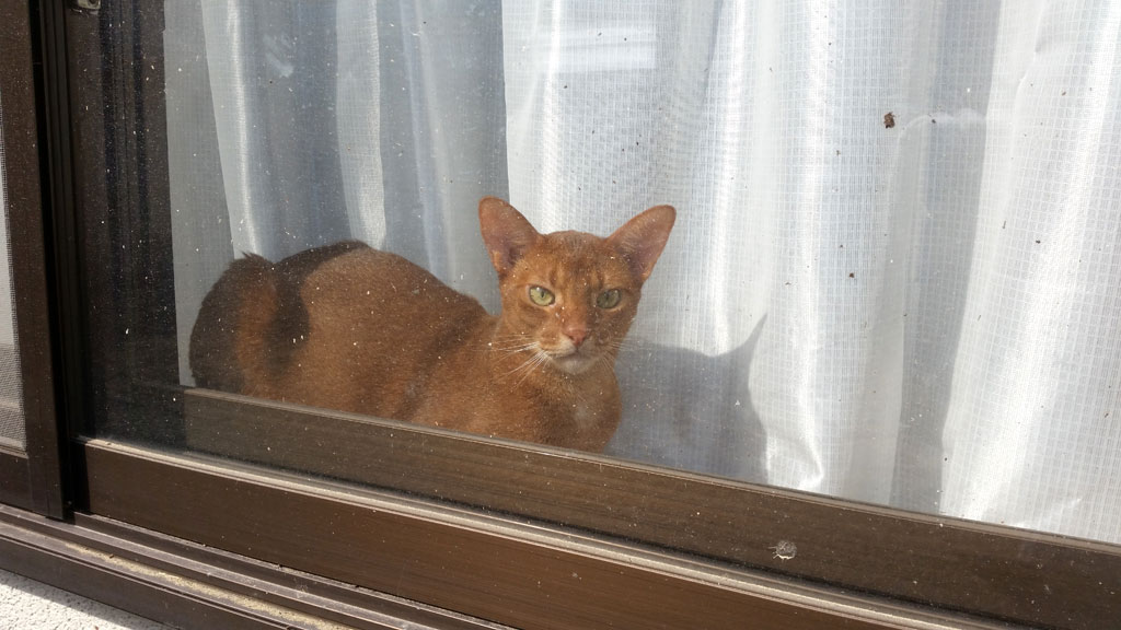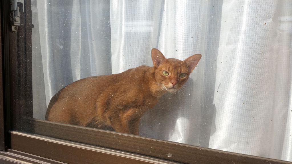 これは、1週間と1日も前の事になりますが、外から見た、我が家の窓際で寛いでいたアビのすけ君。