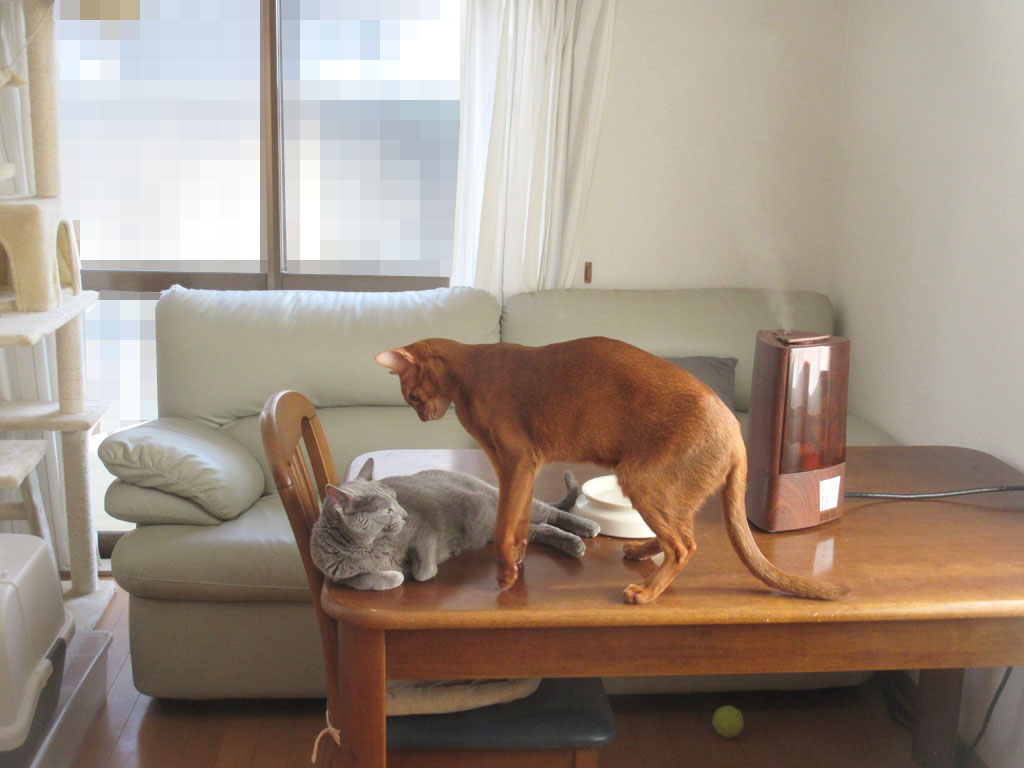 1日1回はシャーされてるアビ。もう久しく、1日に1回はアビのすけロシ子にシャーされてるもんなぁ~…、そう言えば、以前、埼玉県のブリーダーさんの所にお邪魔して、アビのすけのお父さんに合わせて貰った事があるのですが、その時、ショコラ君がキャンディーちゃんに茶々を入れてて、ショコラ君がシャーされてたのを思い出して、やっぱり血は争えない…、アビシニアンの男の子はいらん事しぃ~ばっかり…。(笑)