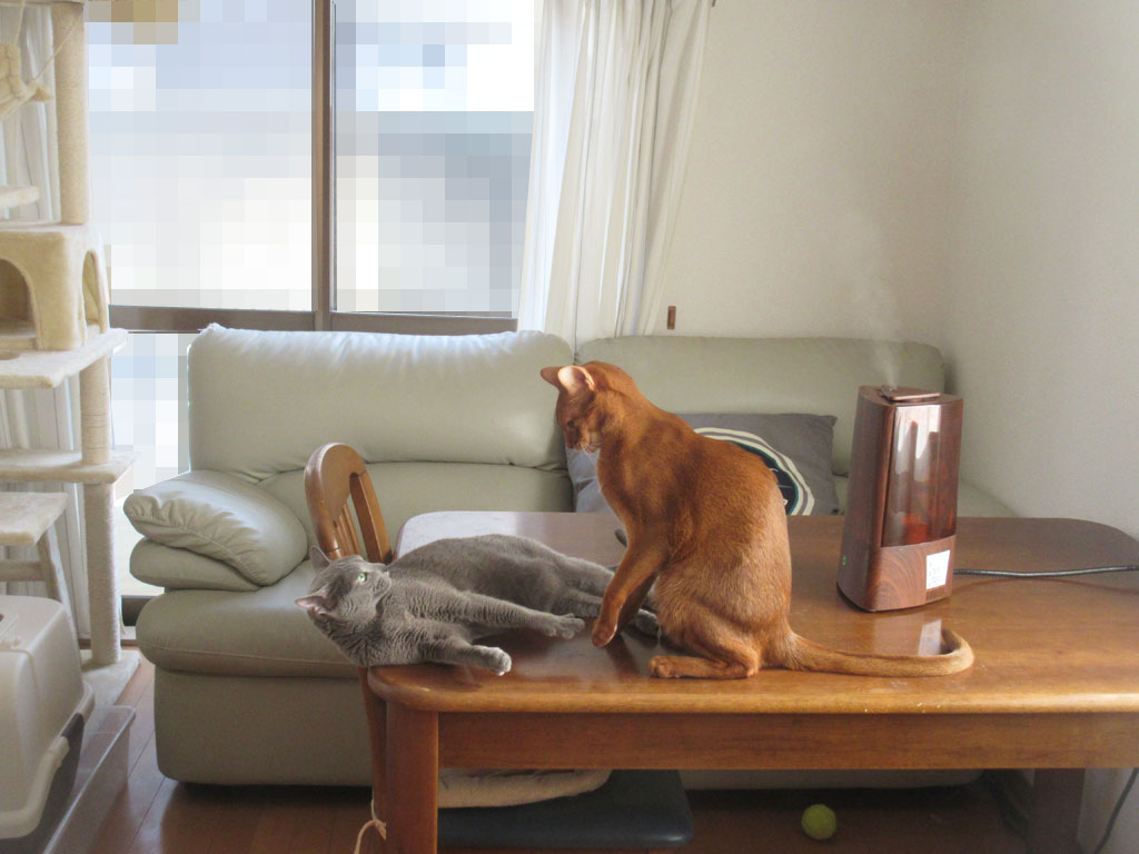 理想的なロシ子とアビのすけ。この日はとっても天気が良くて、そんな中、我が家の猫たちが仲睦まじくしているのかと思ったのですが、そんな事がある訳がない…!