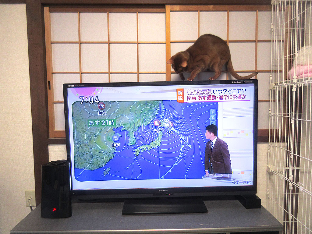 NHKの朝の天気予報の指し棒に反応して、朝からジャンプしてテレビの上に飛び乗って、本当に騒がしい奴。