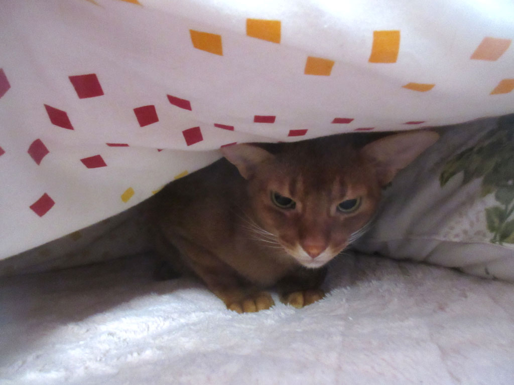 ロシ子の体重測定を終えた私は、のそのそとベットに歩み寄り、布団をちらっとめくってやったら、アビのすけがひっそりと「やばっ…。」みたいな顔。