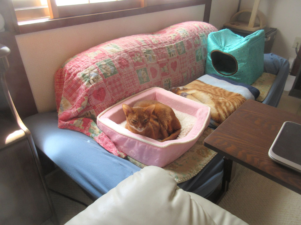 ここにいたアビのすけ。そんなこんなで、アビのすけを探そうと振り返ったら、アビのすけ、ここで寝てました…、私が部屋に入った時に、この場所は真正面に見えるのですが、全くアビのすけに気付かなかった…。