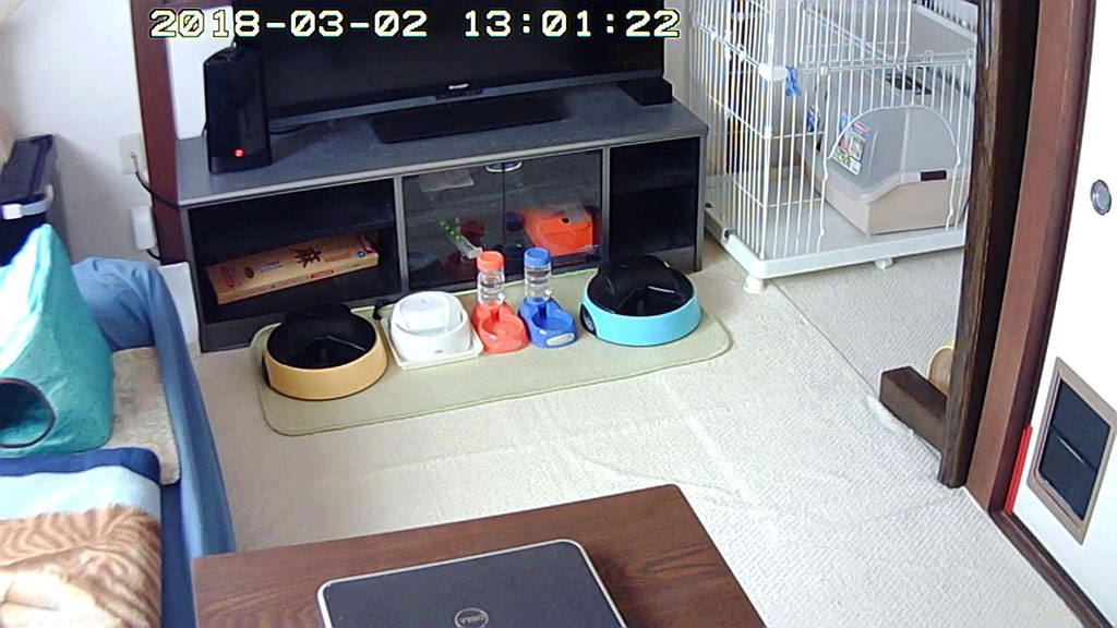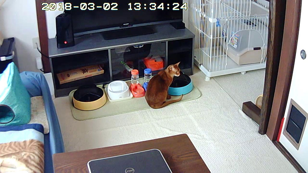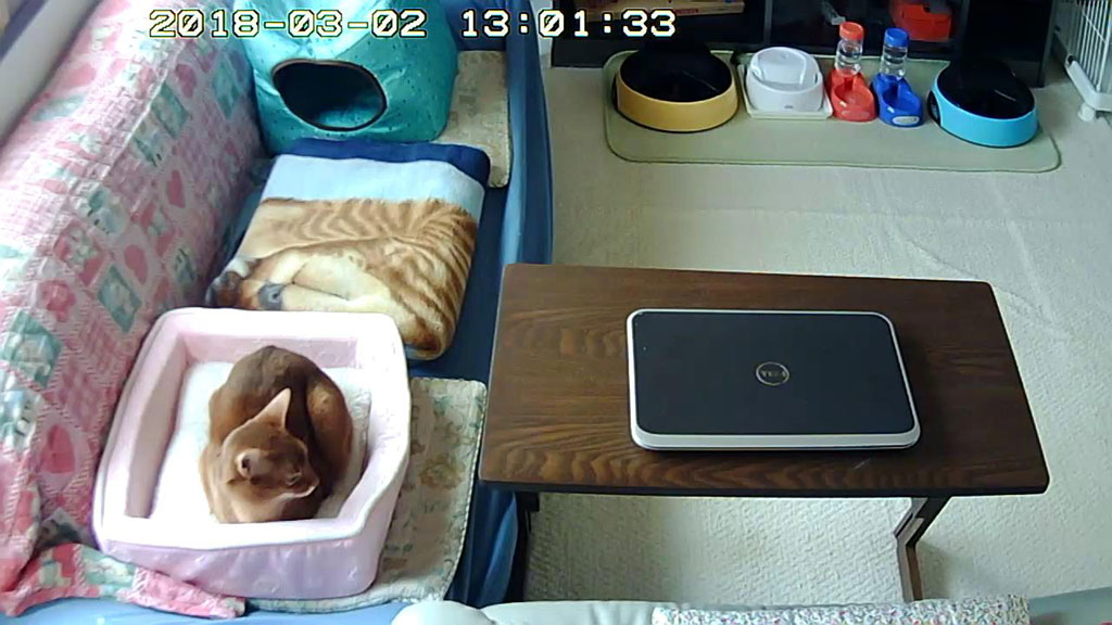 アビのすけが現れない。そして、私が1階に下りて間もなく、2階の猫たちのお昼ご飯の自動給餌器が動き始めたのですが、動き始めてから1分以上も経過していたのに、すぐ傍の、2階のソファーベットの上の猫ベットで寝ていたアビのすけが現れない…。