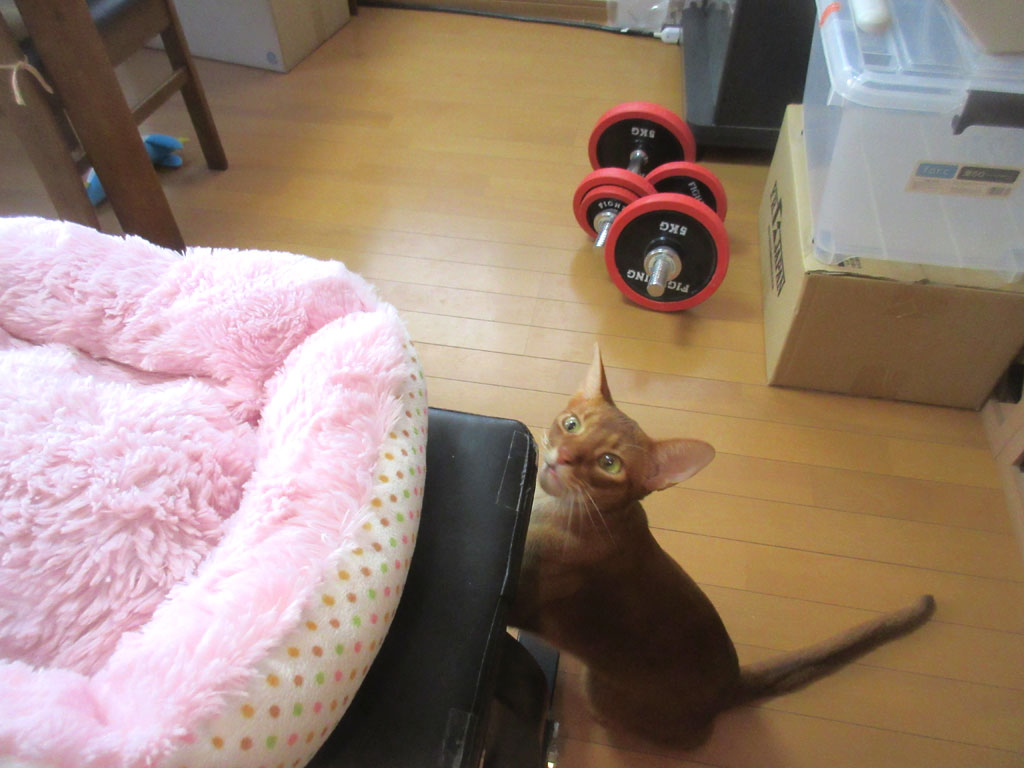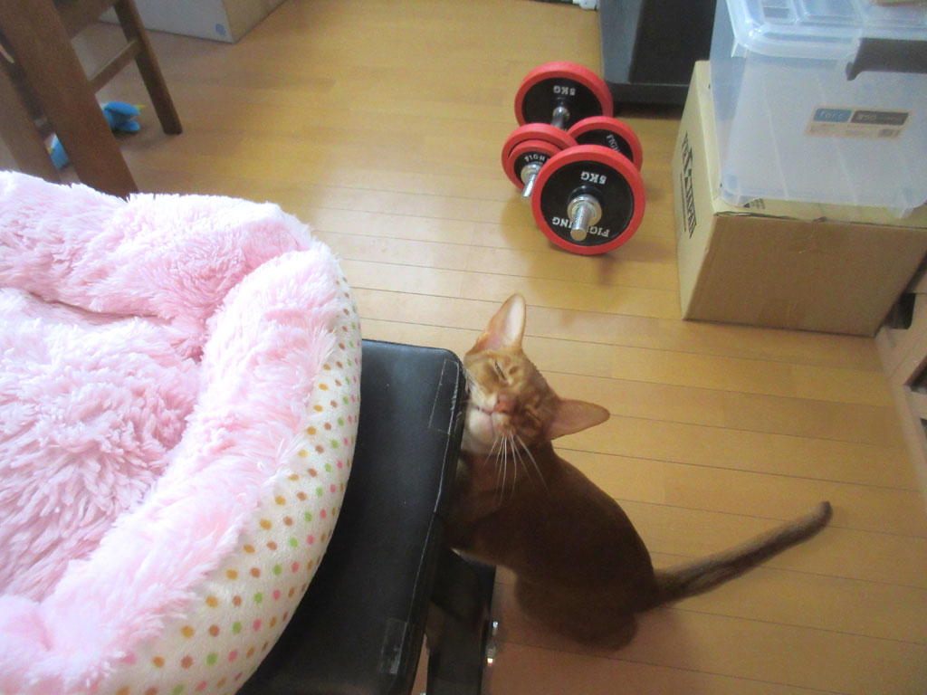 最近は使っていない、私の筋トレ用のベンチの角っこにスリスリ、スリスリ…、あぁ~、アビのすけって本当におバカだわぁ~…。