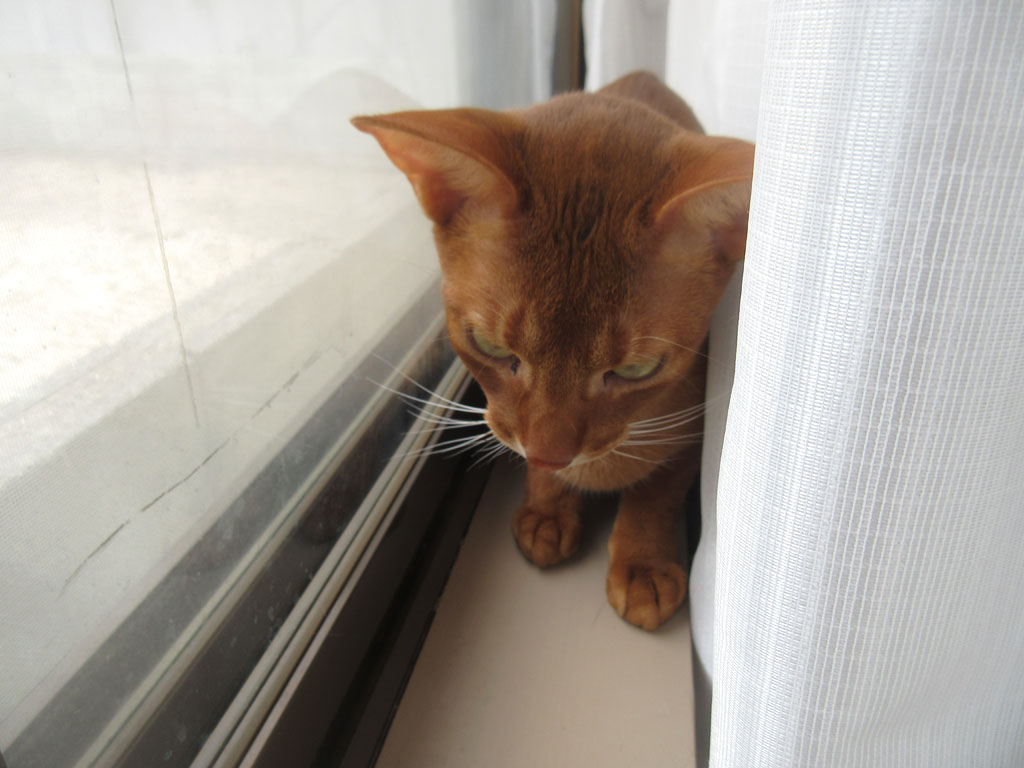 そんな人は少ないとは思いますが、カーテンはしているものの、私、通行人が猫たちを見つけて、我が家のこの窓に近付いて、猫たちや家の中を覗かれたりするのが嫌で…、ロシ子はグレーなので目立ちにくいですが、アビのすけはめっちゃ目立つので、あまり目立たないでいて欲しいのです…。