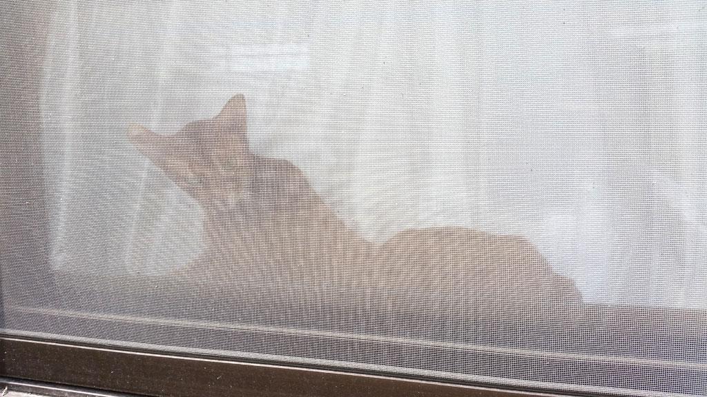 でも、1枚目の写真を撮る前は、アビのすけ、こっち側の網戸のある方でこんな感じで横たわっていて、私、始め、アビのすけがいる事に気付かなかったんだ…。