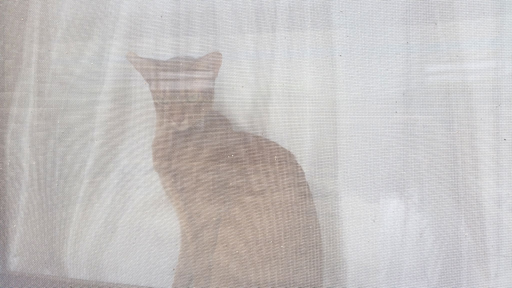 でも、網戸側のこっち側にいると、お座りをしてても、こんな感じで網戸があるから見にくくって、私、親バカで、我が家の猫たちは美猫だと思っているので、外から猫たちを見られるのが嫌で、なので、こっち側にいてくれると有難いんだけど…。