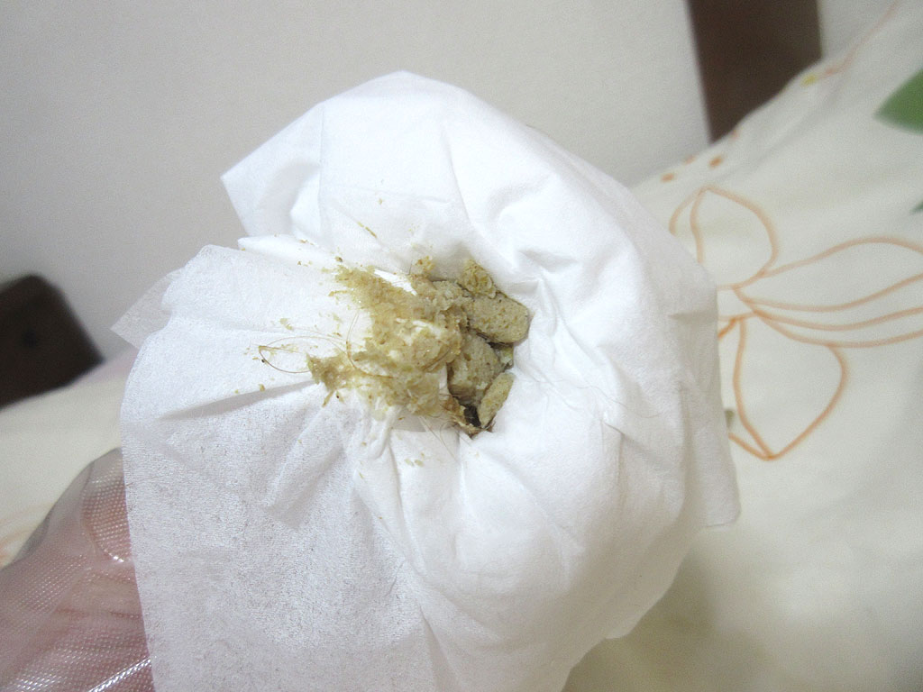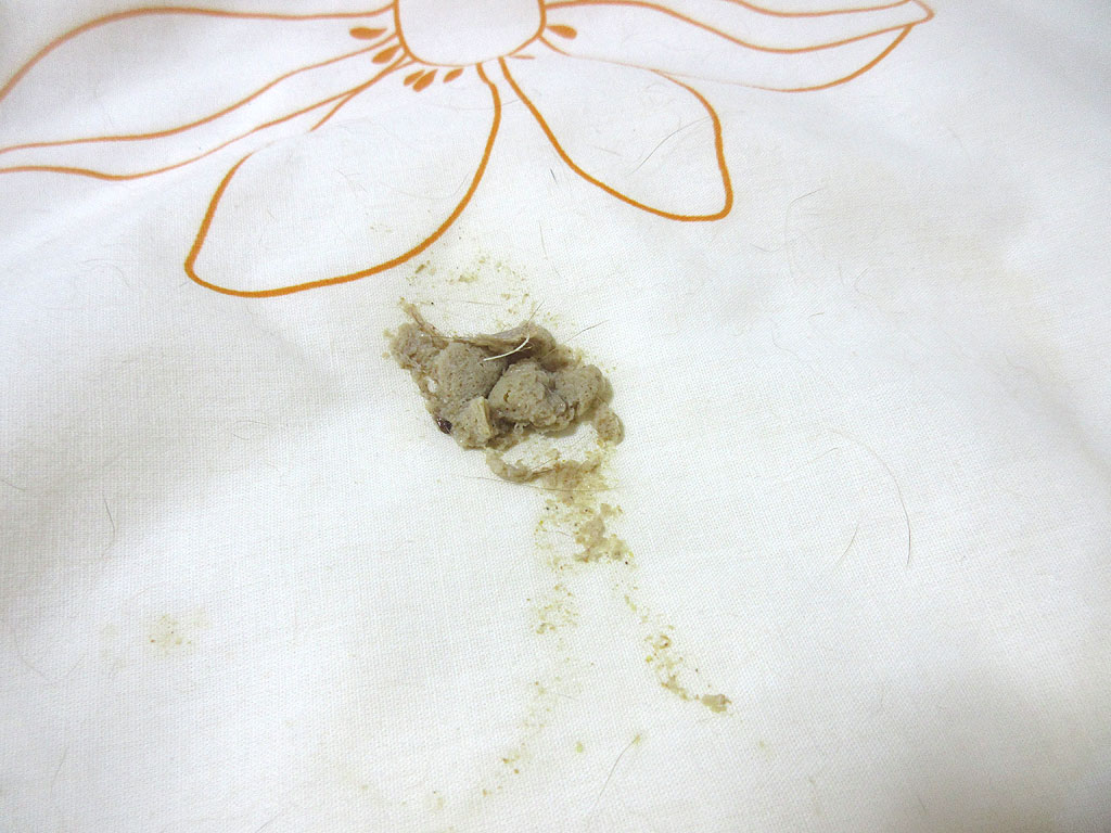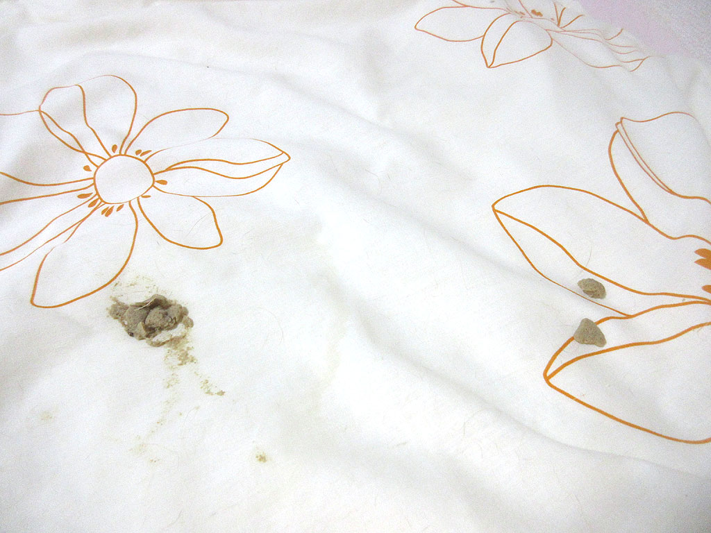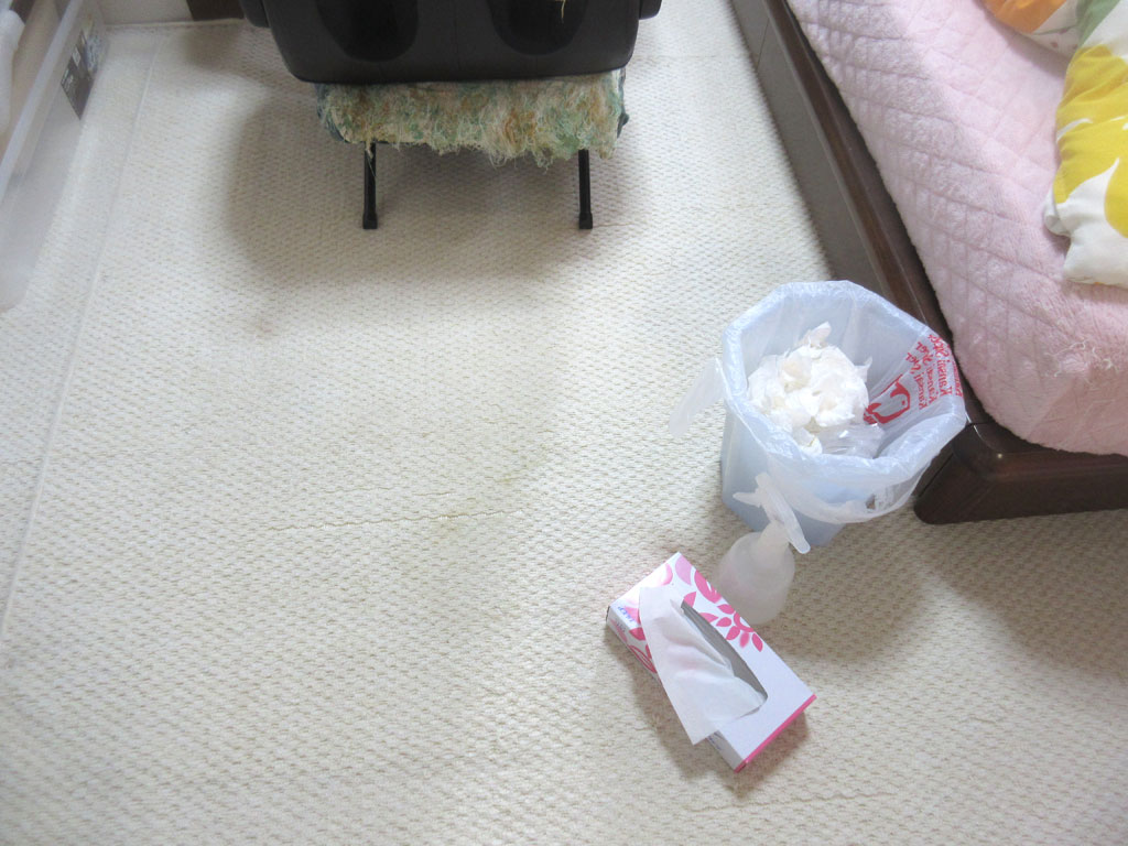 私はもう、ガッカリしていたのですが、布団の上の吐いた物は、何が何でも掃除をしなければ寝れないしと、いそいそと掃除を始め…、これ、布団の上の吐いた物…。