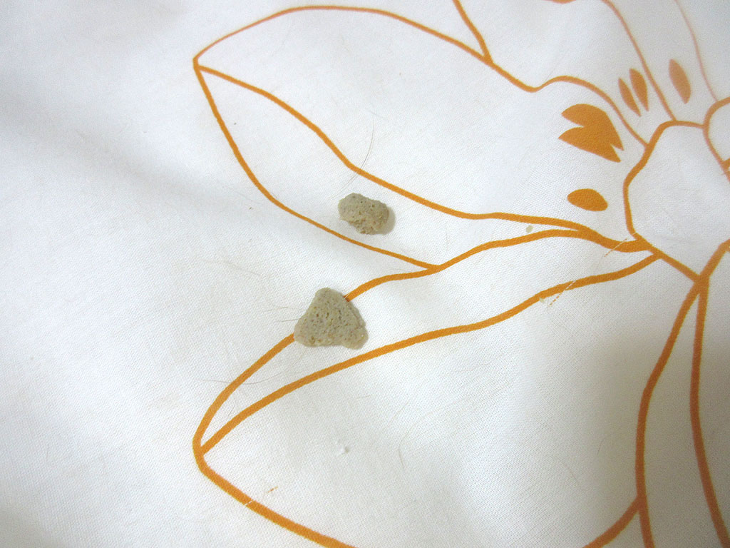部屋の電気を付けて、部屋の中を見回してみたら、何と、私が寝ようとしていた布団の上に吐いた物が…、尚も布団をめくってみると、私が布団に入った時に転がったのか、しっかりと水分を含んだカリカリが数粒、転がってて…。(涙)