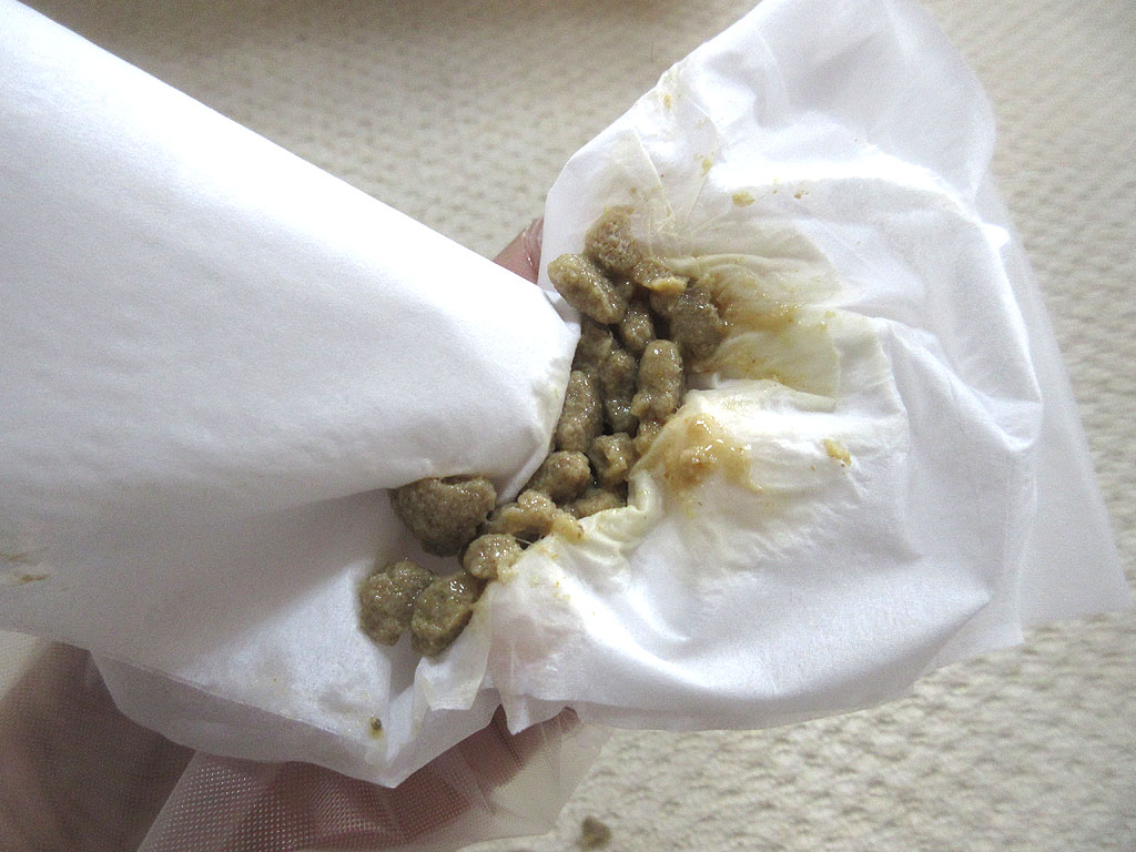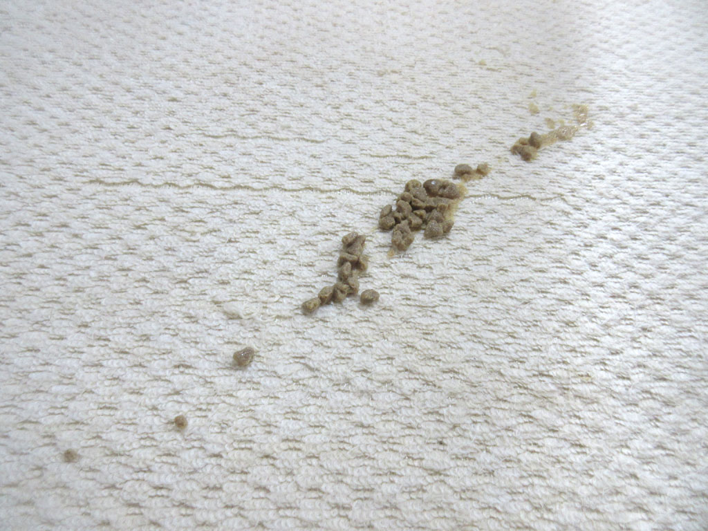 これ、その吐かれた跡…、しっかりと水分が含まれてるので、食べた後、そこそこの時間が経ってから吐いた物…、でも、今さっき吐いたと言う感じではなく、晩8時のアビのすけの1回目ご飯の後に、アビのすけが吐いたのかな…。
