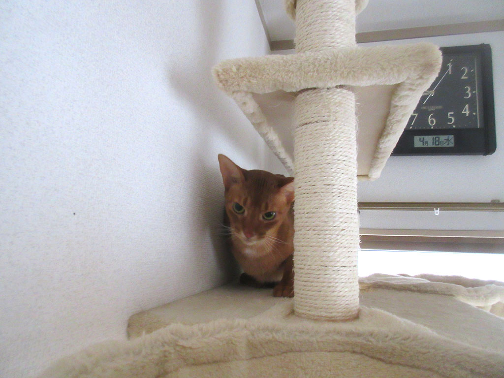 アビのすけ、猛ダッシュで1階まで逃げて行き、キャットタワーのここに逃げ込んで…、私が罵声を浴びせていると、アビのすけも一応、ビビってると言うか、恐縮していると言うか…。