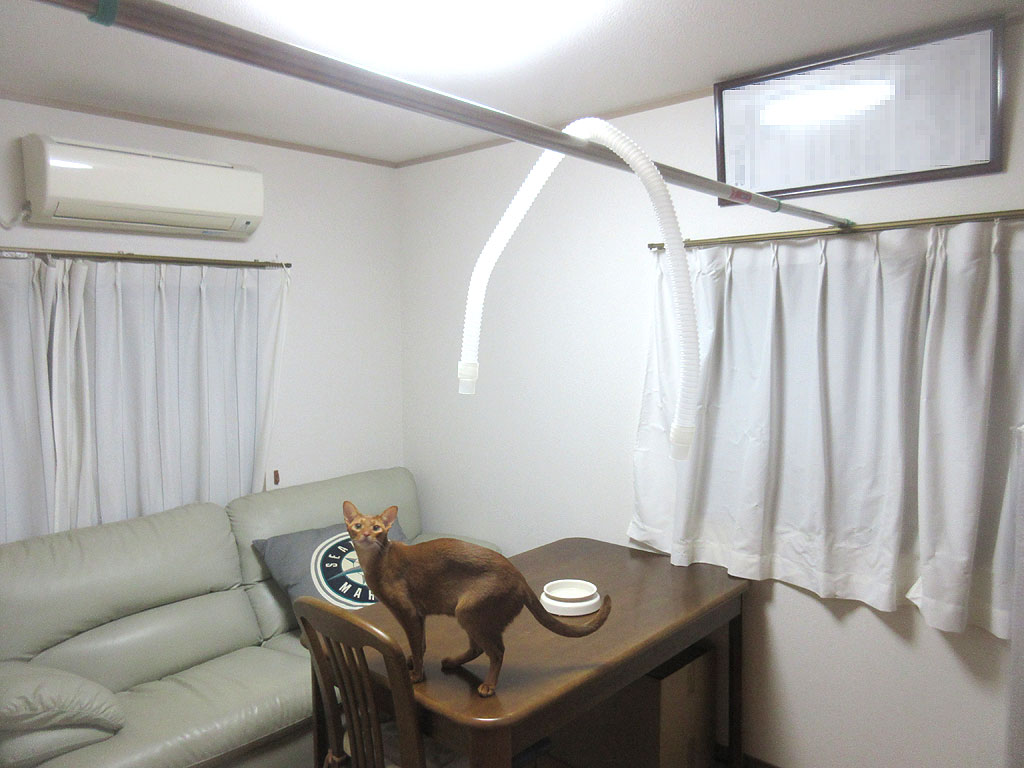 これは、おとといの晩の事でしたが、我が家で初めて、ロシ子にネブライザーをして、それで、大事な大事なネブライザーの器械なので、ロシ子にネブライザーをした後、付属部品を大事に大事に洗っていたのですが、このホースの中を乾かすにはどうしたら良いかと考えていて、そうだ、ここで干そうと物干し竿に掛けたら、早速、アビのすけがやって来た…。(笑)
