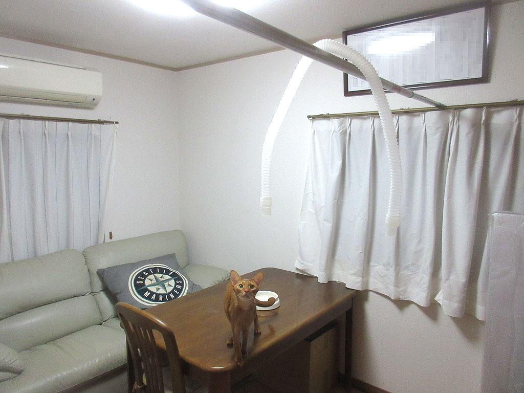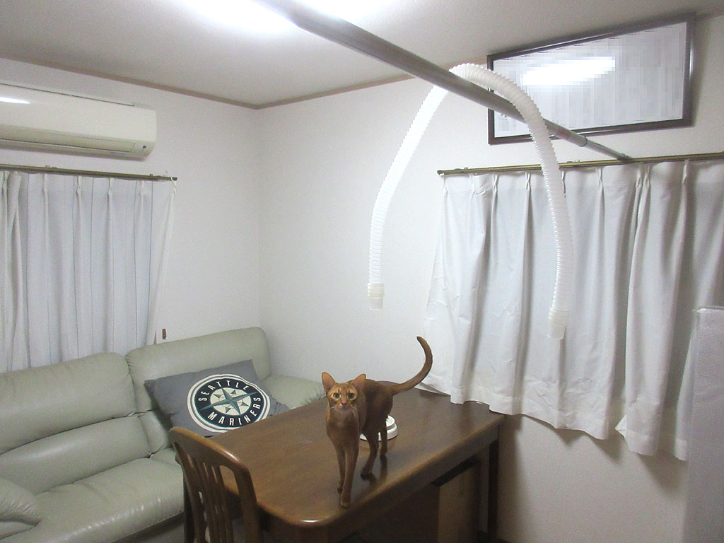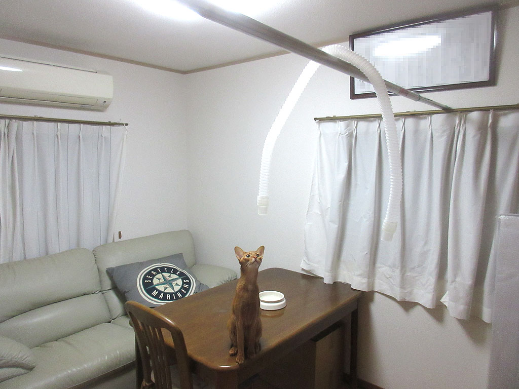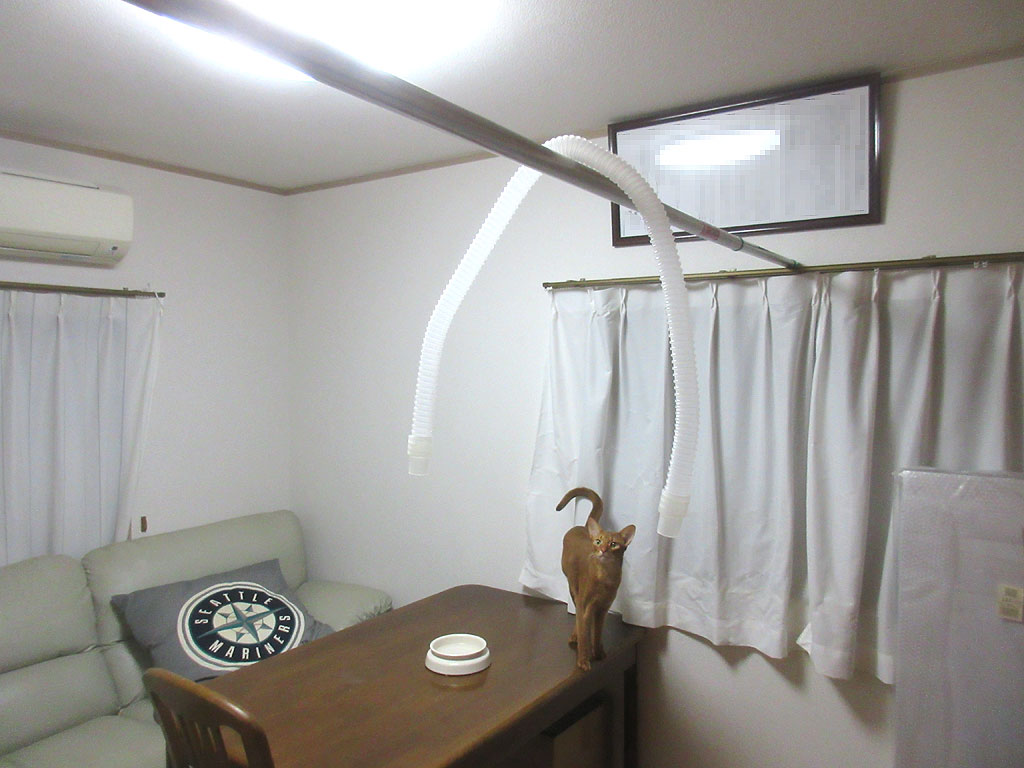 物干し竿の掛けている位置によっては、テーブルに近過ぎると、テーブルの上からアビのすけに悪戯されるし、手前側に寄せ過ぎてしまうと、今度はテレビの上からアビのすけにジャンプされて悪戯されるだろうし…。