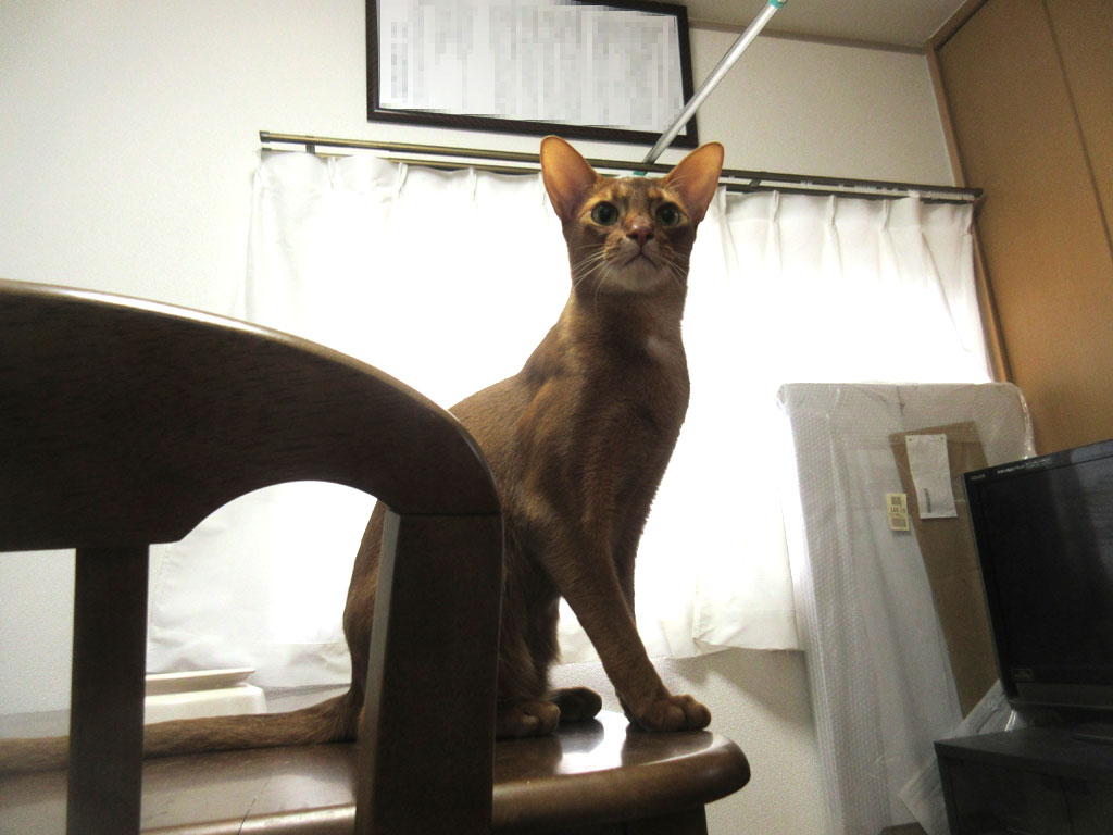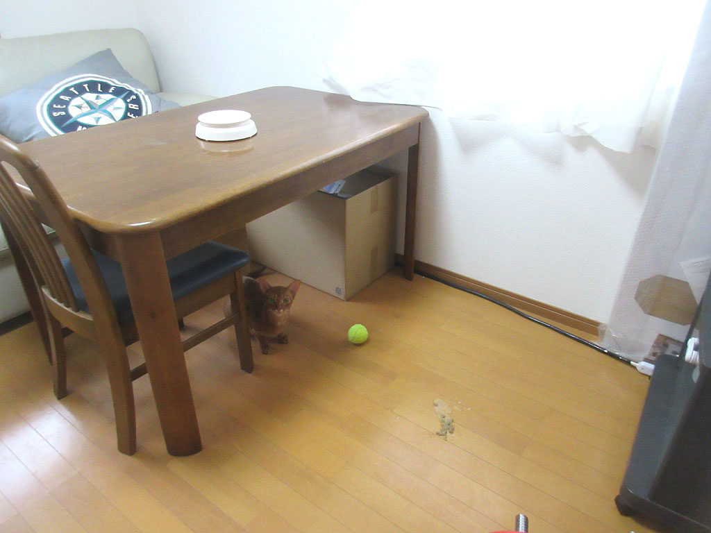 そして、私が必死でアビのすけの吐いた跡を掃除していると、アビのすけはそれを高みの見物…、まぁ、しんどそうな表情を見せられるよりは、こんな元気なアビのすけの方が良いけど…。